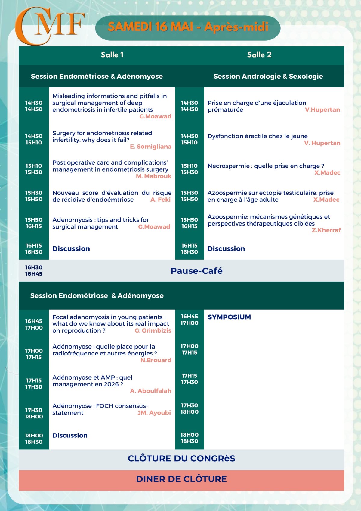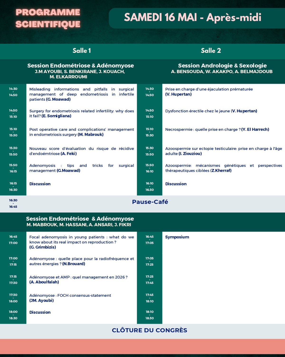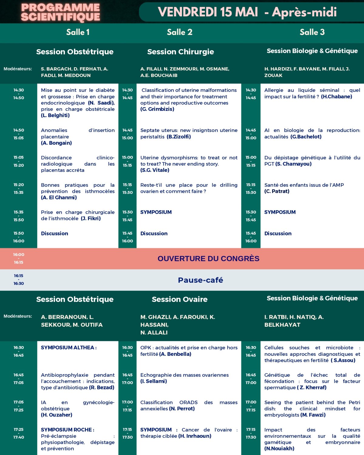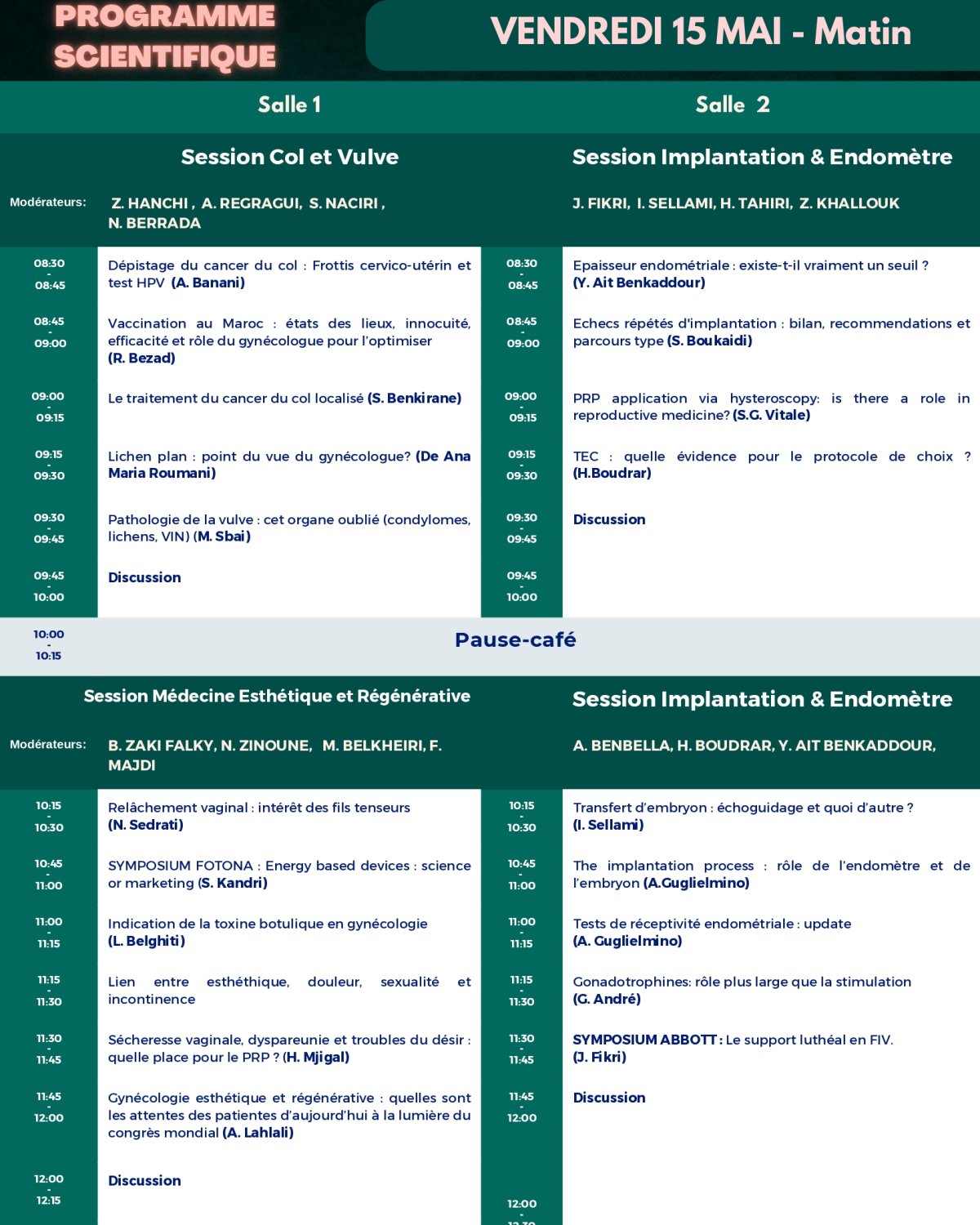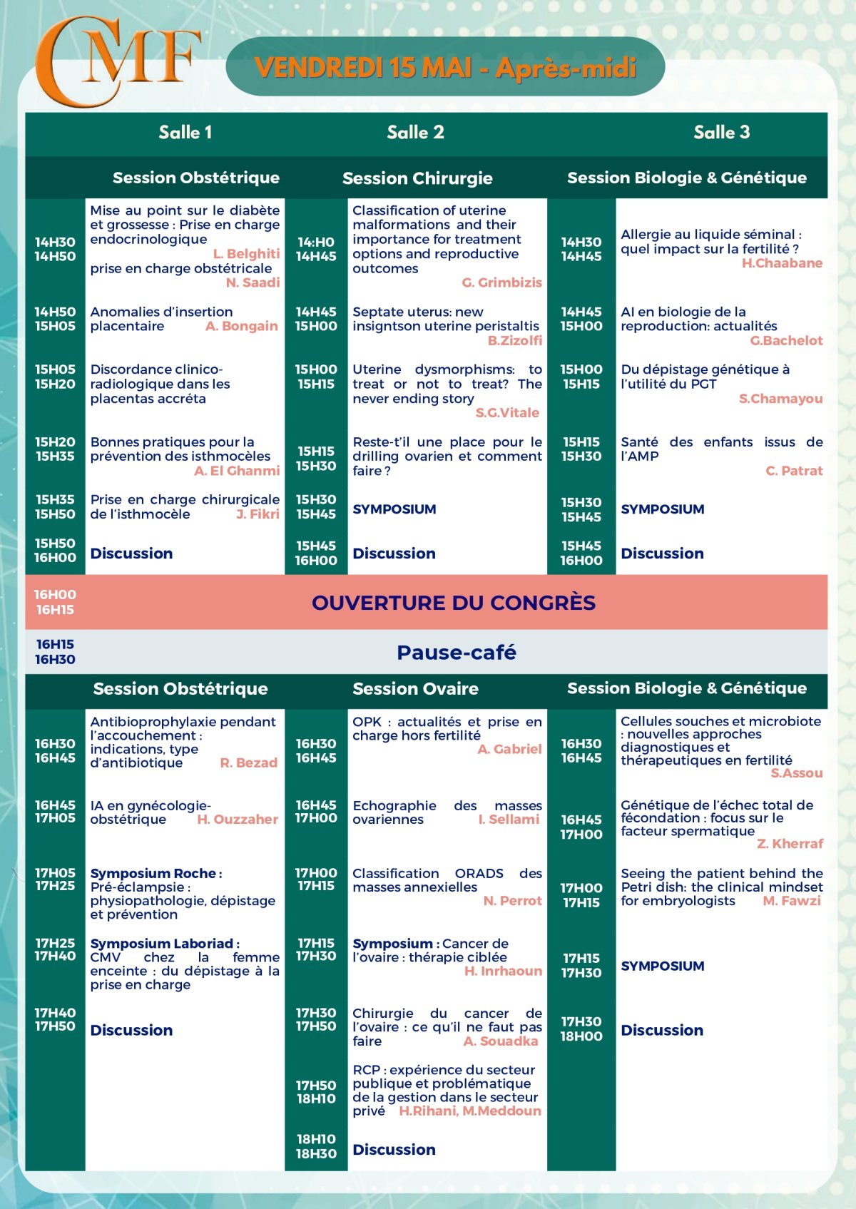 Nous exprimons notre profonde gratitude à nos fidèles sponsors pour leur soutien indéfectible au 8ème Congrès International du Collège Marocain de Fertilité. Malgré les défis rencontrés pour cette édition, ils ont su répondre présents avec une réactivité et un engagement exemplaires, permettant ainsi de faire de cet événement un succès. Leur appui constant est essentiel à la réalisation de nos ambitions et témoigne de leur dévouement envers l’avancement de la fertilité et de la santé reproductive.